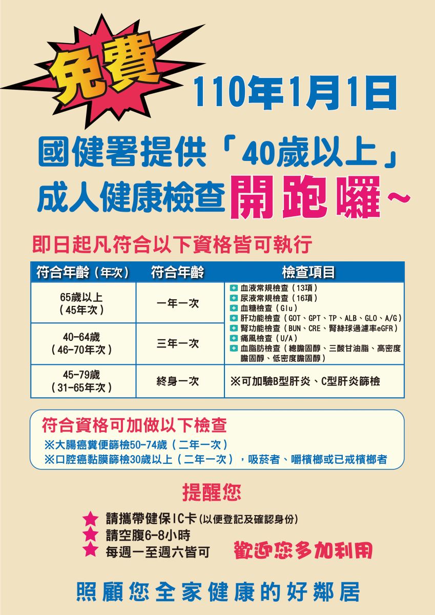 **新年度「40歲以上免費成人健康檢查」自1月1日起開跑囉! 包含驗血驗尿,共46個項目。 1.45年次以前出生者:1年一次 2.46~70年次之間出生者: 3年一次 **45-79歲(65-31年次)終身可免費做一次B型C型肝炎篩檢 **檢查前一天請空腹6-8小時,當天攜帶健保卡到診所報到!