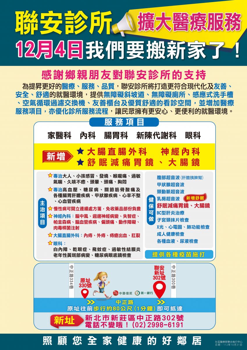 爲提升醫療服務品質,提供更友善的醫療環境,聯安診所搬遷至新莊區中正路302號!