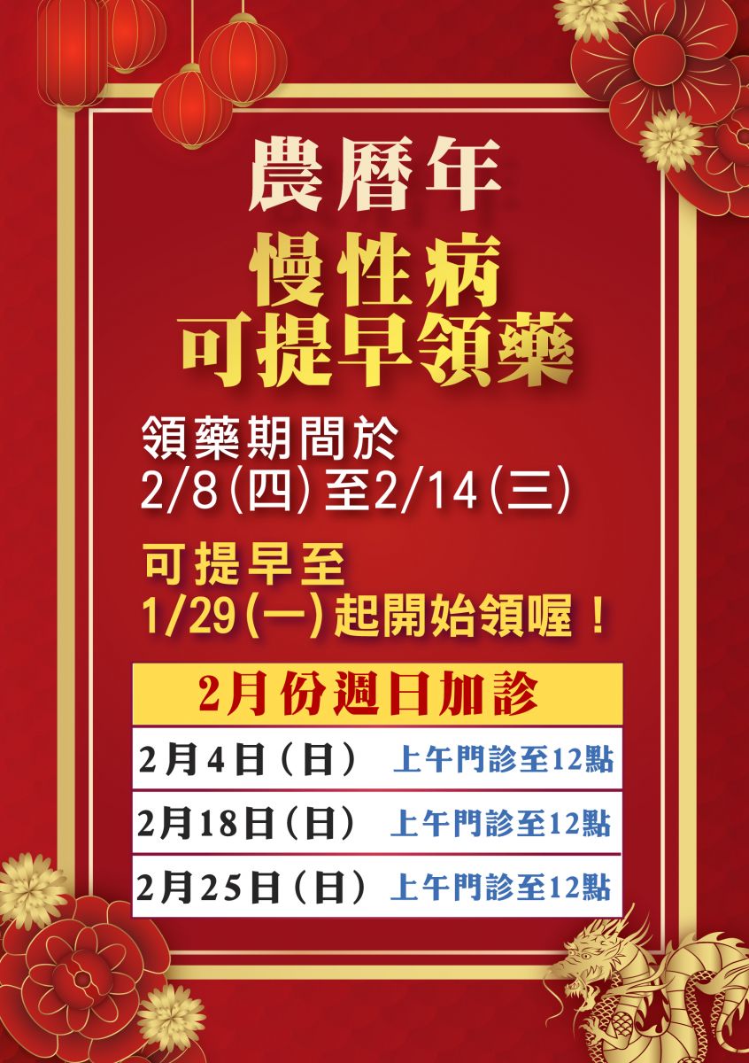 113年春節期間連續處方箋領藥說明與二月週日看診時間