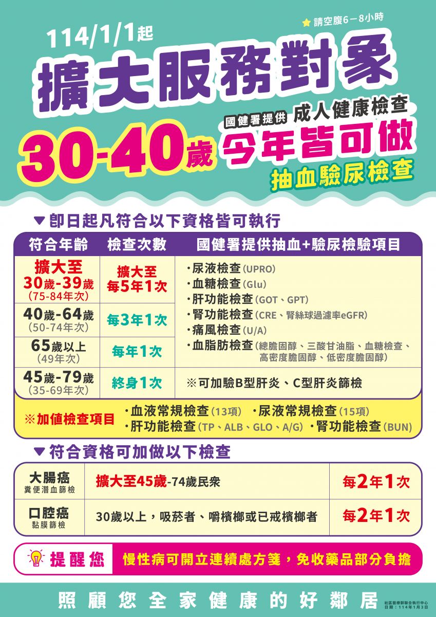 30歲-40歲:今年皆可做(74-84年次)抽血+驗尿