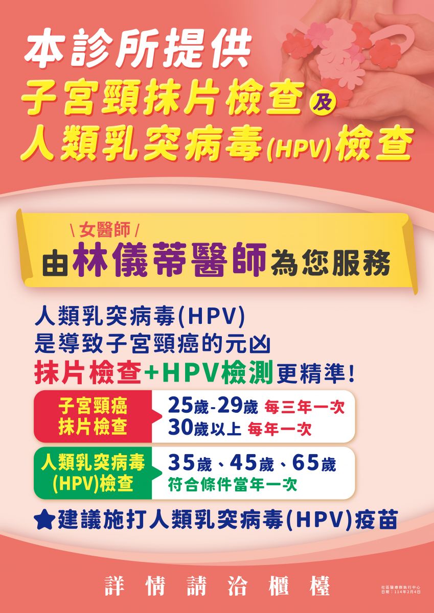 - 本診所提供 ✨子宮頸抹片檢查 ✨人類乳突病毒(HPV)檢查